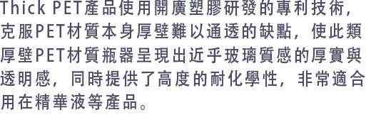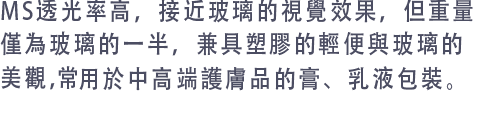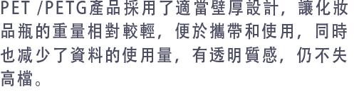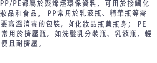 PP/PE都屬於聚烯烴環保資料,可用於接觸化妝品和食品。 PP耐熱性高於PE,囙此PP常用於乳液瓶、精華瓶等需要高溫消毒的包裝,如化妝品瓶蓋瓶身; PE柔韌性優於PP,常用於擠壓瓶,如洗髮乳分裝瓶、乳液瓶,輕便且耐擠壓。